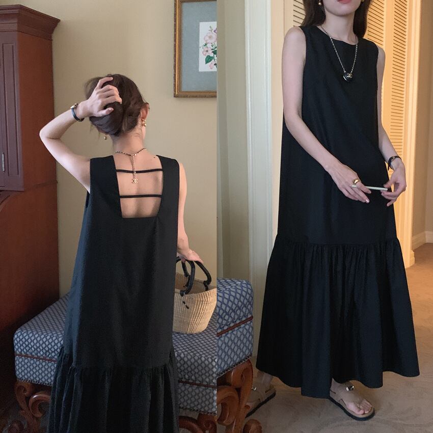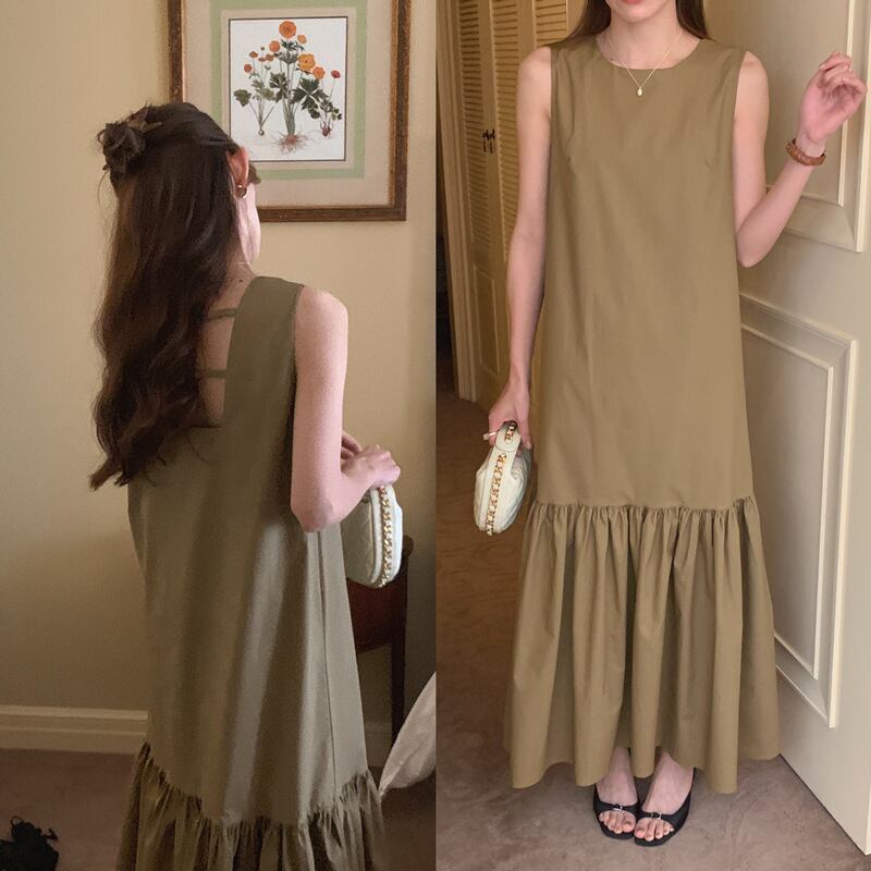 レディース ワンピース ロングスカート ロング ノースリーブ クルーネック 襟なし フレア Aライン オーバーサイズ 裾ワイド ティアード フェミニン プリーツ タック バックコンシャス 薄手 綿 ポリエステル スプライシング きれいめ シンプル おしゃれ レトロ 個性的 存在感 無地 夏 OL 通勤 デート お出かけ アウトドア キャンプ イベント リゾート 旅行 女子会 休日 バカンス ショッピング 楽ちん 普段使い ゆったり ワンサイズ 黒 オフホワイト カーキ