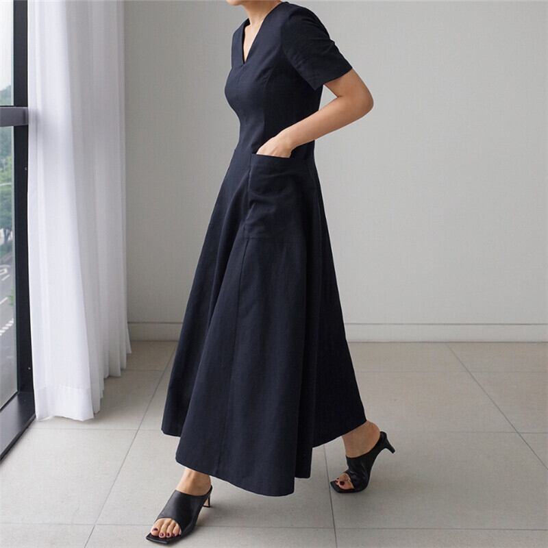 レディース ワンピース シャツワンピ ロングスカート ロング 半袖 レギュラースリーブ Vネック 襟なし Aライン 大振りタイプ タック ポケット ハイウエスト コットン 大人可愛い シンプル カジュアル おしゃれ 個性的 無地 夏 オフィス OL 通勤 学生 デート お出かけ イベント リゾート 女子会 休日 ショッピング 発表会 カフェ 普段使い S M L XL カーキ ネイビー