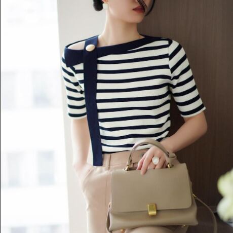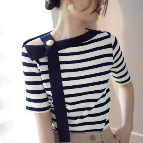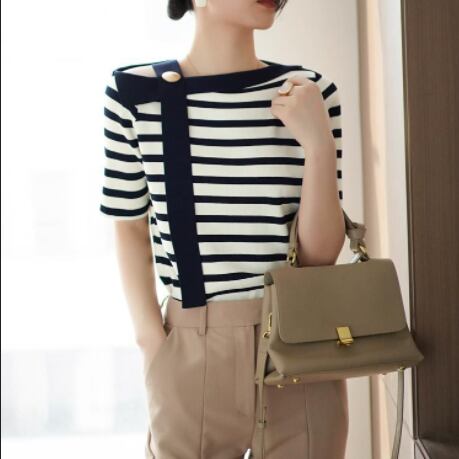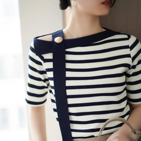 レディース トップス ニット セーター プルオーバー サマーセーター サマーニット ミドル丈 半袖 5分袖 スクエアネック ボートネック ストレート アシンメトリー フェミニン 伸縮性 ボタン 肩見せ ポリエステル 大人可愛い きれいめ シンプル カジュアル 上品 おしゃれ レトロ こなれ感 個性的 モダン クラシカル ナチュラル マリン ボーダー 春 夏 秋 ロングシーズン ママ オフィス OL 通勤 お出かけ 休日 韓国 コーデ 楽ちん 普段使い 着回し インスタ映え 定番 高見え M L ネイビー