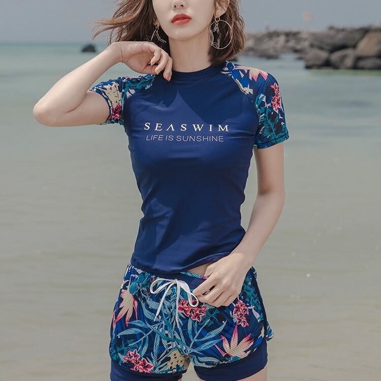 水着 レディース フィットネス 体型カバー 短パン 半袖 上下セット シンプル カジュアル おしゃれ 存在感 クール 花柄 リゾート 旅行 温泉 プール 夏 海 体型カバー 日除け M L XL 2XL 3XL ピンク 水色 ネイビー