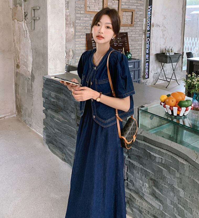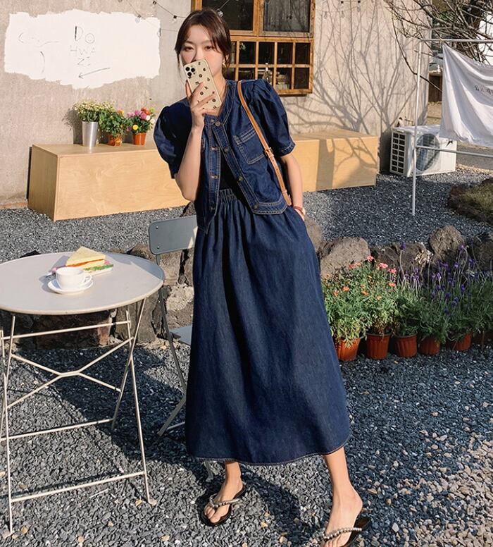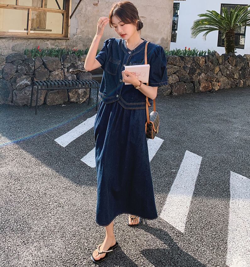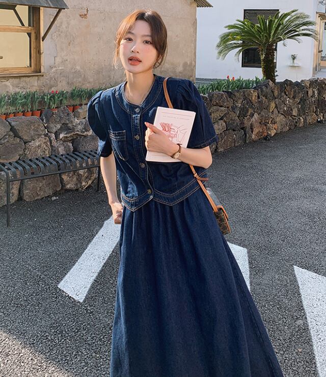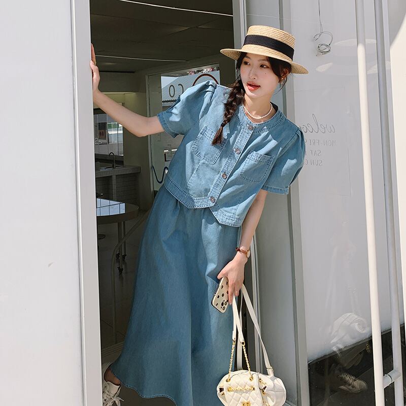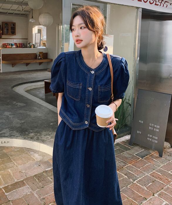 このツーピースは、カジュアルながらもおしゃれな雰囲気を演出するためにデザインされた、夏の必需品です!半袖のジャケットとミモレ丈のスカートが、軽やかで爽やかな印象を与え、オフィスやデート、お出かけなど、さまざまなシーンでのスタイリングを楽しむことができます。ノーカラーデザインとハイウエストのスカートが、スタイルアップをサポートし、ポケット付きで実用性も兼ね備えています。デニムコットン素材なので、デイリーに使える一着です。