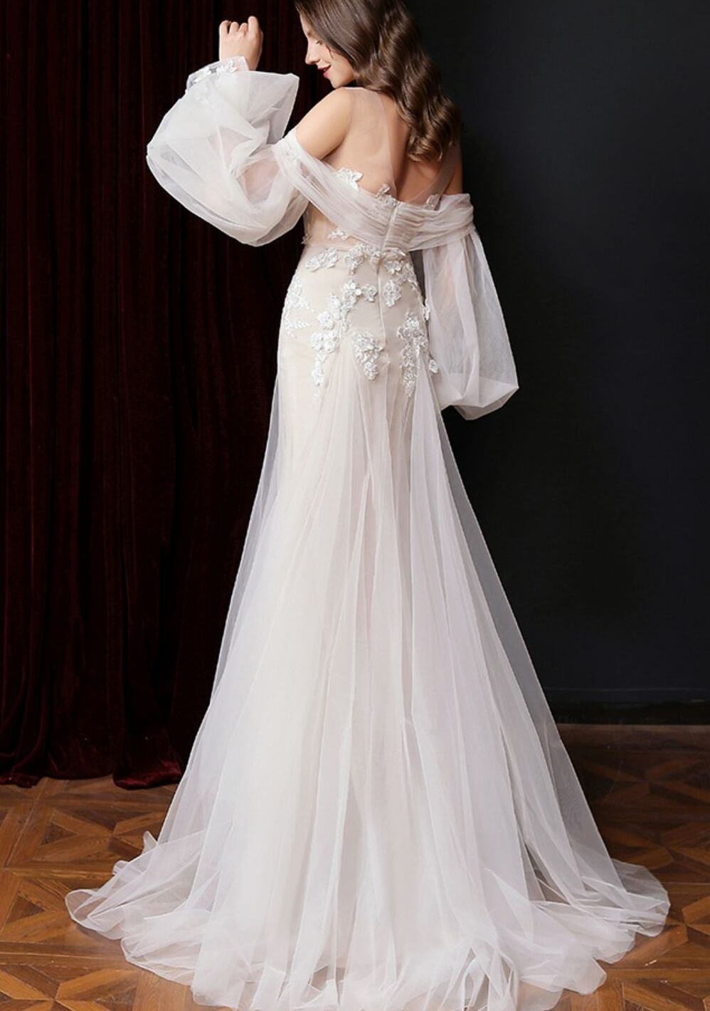 エレガントなロングドレスのシルエットに、ボリューム袖とフィッシュテールが施され、個性を引き立てながらも大人可愛い印象を与えます。