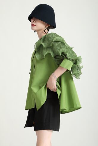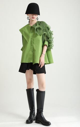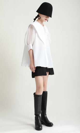 襟付きのフリルがアクセントになり、シンプルながらも存在感のある一着です。