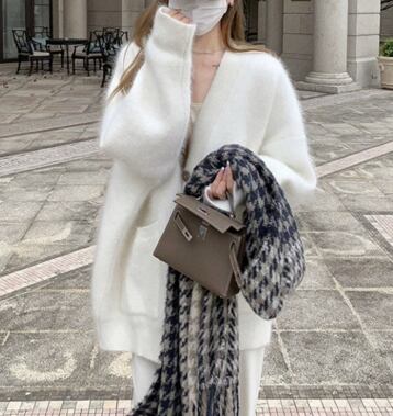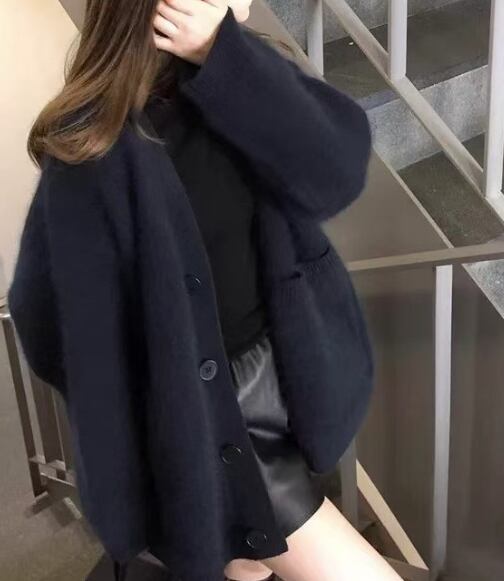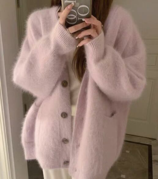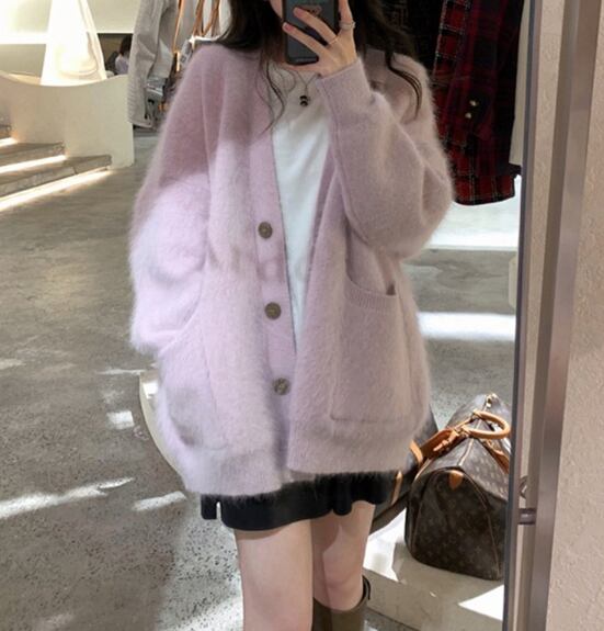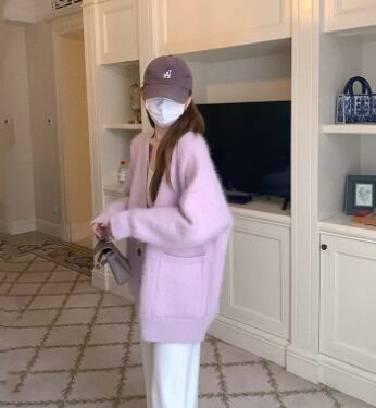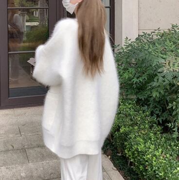 このもこもこでふわふわのカーディガンは、Vネックデザインとワイドなシルエットが魅力。ポケット付きで実用性も兼ね備えています。