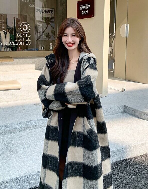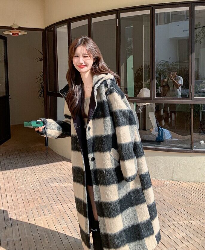 レディース アウター チェックコート ロングコート 丈長 長袖 ボリューム袖 襟なし フード ワイド オーバーサイズ ふわふわ ポケット ボタン かわいい 大人可愛い カジュアル おしゃれ かっこいい こなれ感 ガーリー クール 存在感 ラブリー キュート ナチュラル チェック 秋 冬 ママ 通勤 学生 学校 通学 デート お出かけ 旅行 公園 女子会 休日 ショッピング カフェ モノトーン 普段使い 着回し S M L XL ベーシックカラー 秋カラー