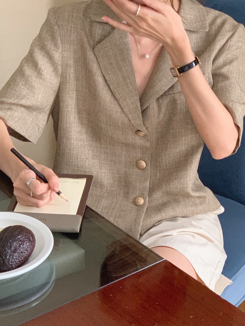 さらりと羽織れるミディアム丈のレディーステーラードジャケット。Vネックと角襟のきちんと感に加え、半袖デザインで軽やかな着心地を実現しました。ボタン付きのシンプルな無地デザインは、清楚で上品な印象を与えます。