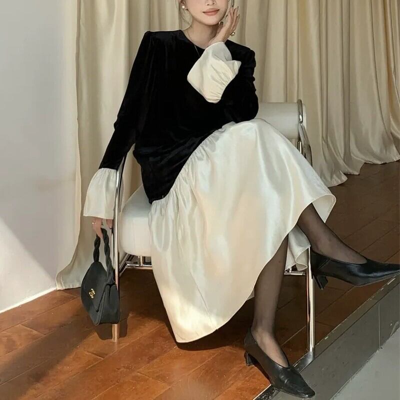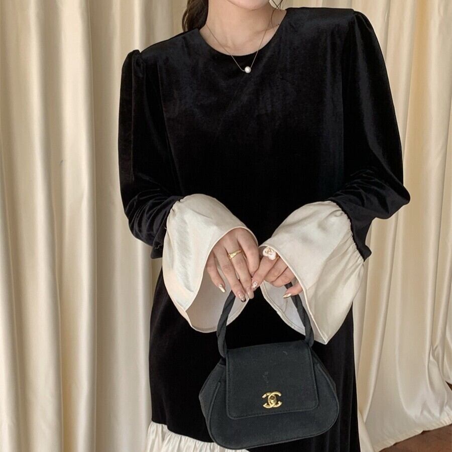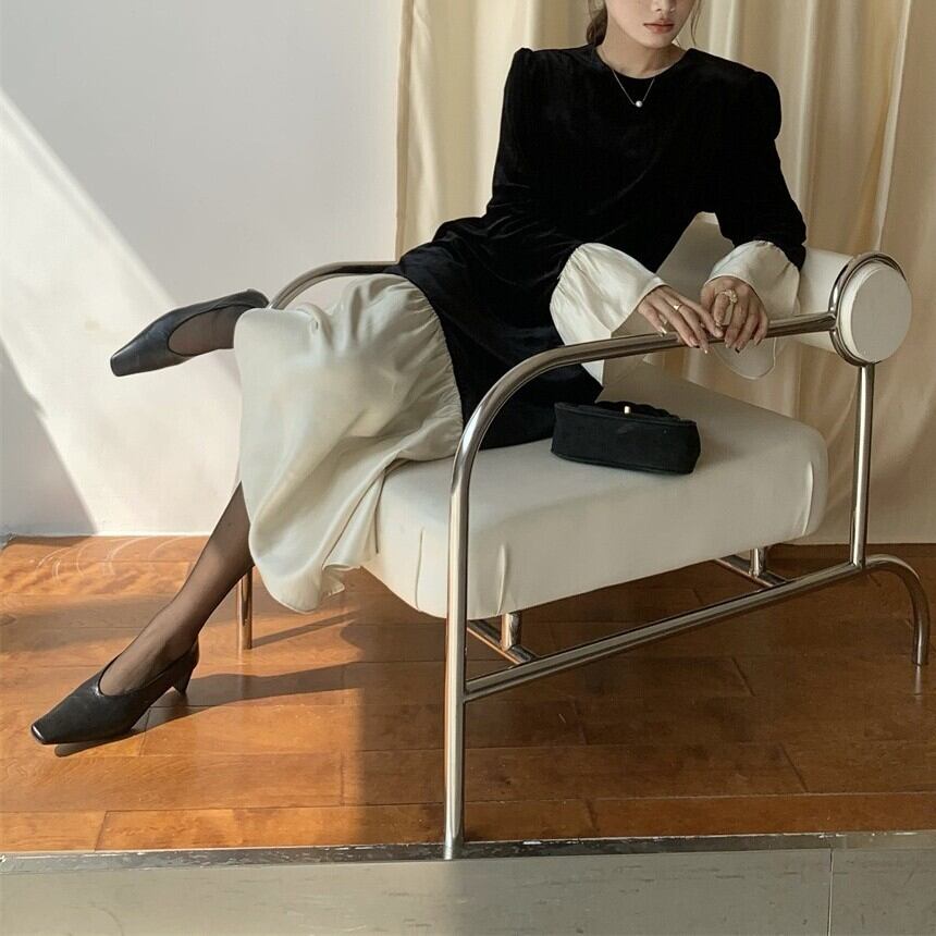 ドレス ワンピース ウェディング パーティー 結婚式 二次会 披露宴 フォーマル 謝恩会 ロング 長袖 ラウンドネック スリム ハイウエスト きれいめ 大人可愛い 上品 おしゃれ かっこいい ガーリー クール 無地 イベント ホテル レストラン 韓国 脚長 女子会 春 夏 秋 冬 シーズンレス フリーサイズ ブラック