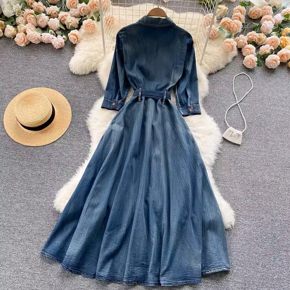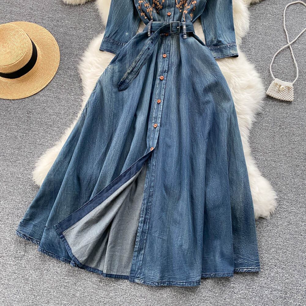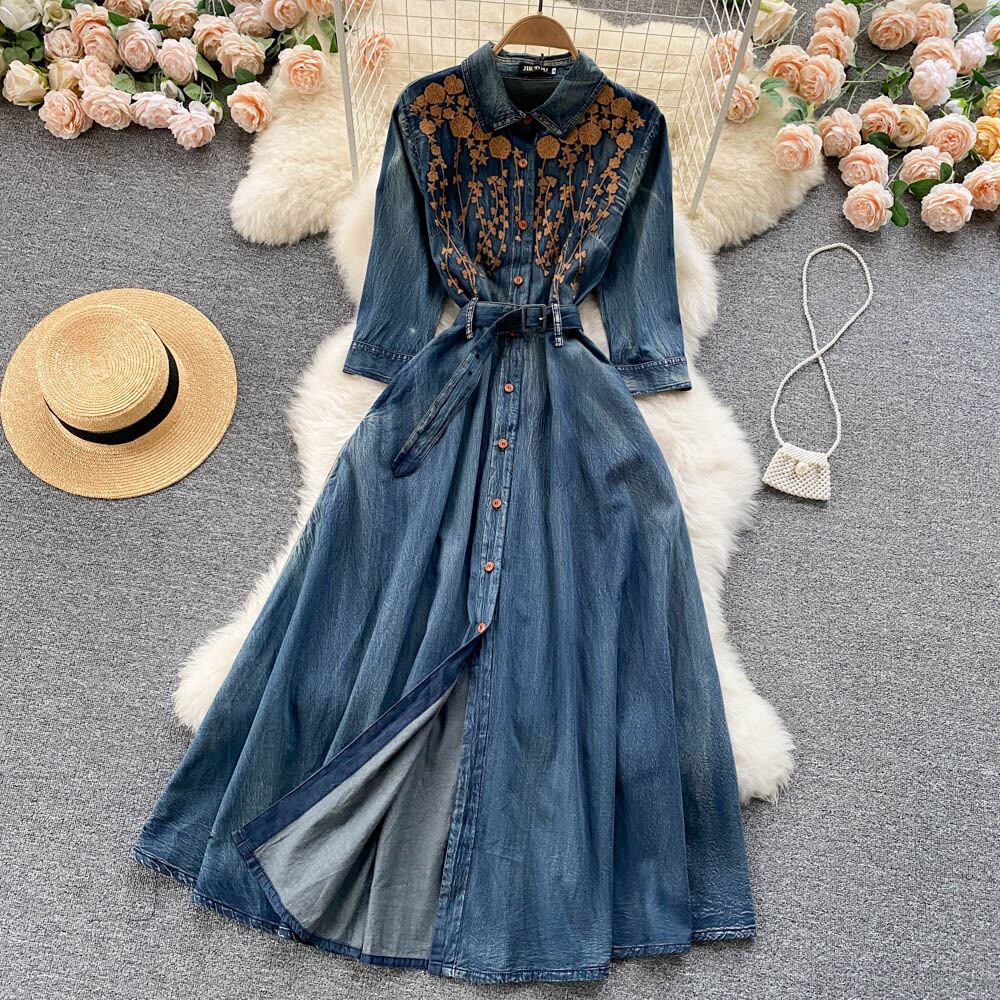レディース ワンピース デニム ミディスカート ミディアム丈 長袖 レギュラースリーブ ポロカラー フレア Aライン 裾ワイド ストリート シングルブレスト 刺繍 ハイウエスト 前開き ボタン デニム 中厚手 刺繡 ポリエステル 大人可愛い カジュアル おしゃれ レトロ 個性的 存在感 花柄 春 秋 ロングシーズン OL 通勤 デート お出かけ パーティー イベント リゾート 旅行 公園 女子会 休日 バカンス ガーデン ショッピング 発表会 カフェ 普段使い インスタ映え 香港スタイル M L XL 2