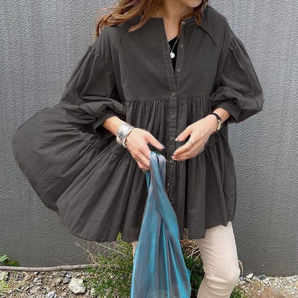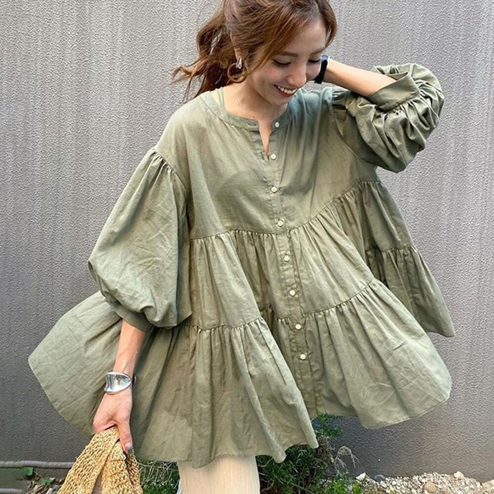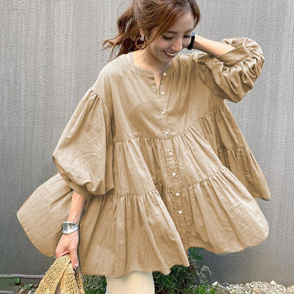 レディース トップス ブラウスのご紹介です!オーバーサイズのティアードデザインが特徴的で、ふんわりとしたシルエットが女性らしい印象を与えます。レギュラー丈の半袖とクルーネックで、カジュアルながらもおしゃれな雰囲気を漂わせ、さまざまなシーンで活躍します。