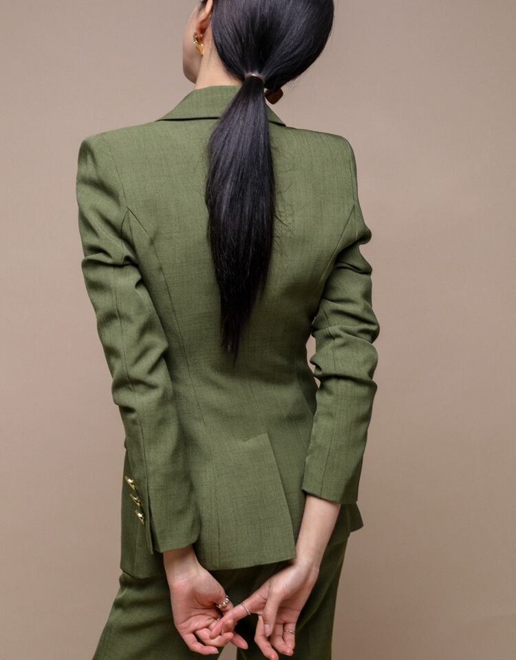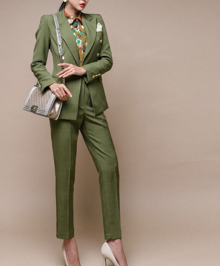 長袖の襟付きジャケットとハイウエストのストレートパンツが、あなたのスタイルを引き立てます!