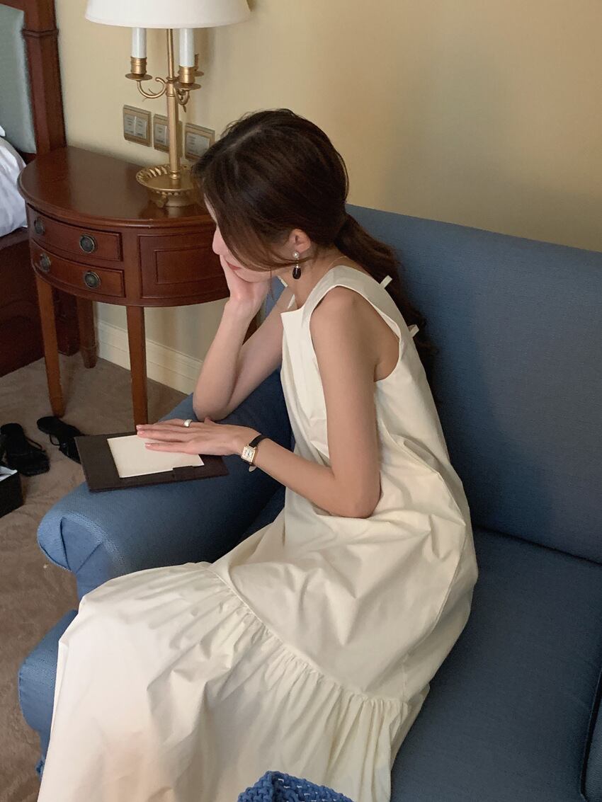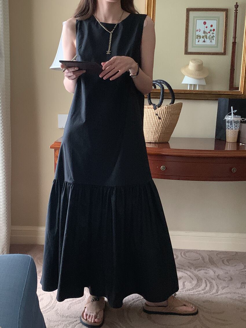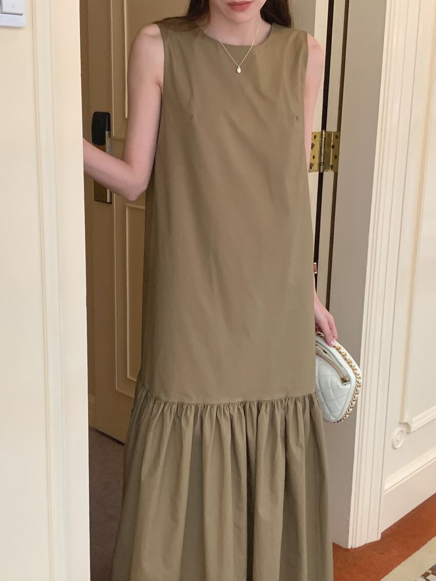 軽やかなフレアシルエットが魅力のノースリーブロングワンピース。ラウンドネックと背中のさりげない開きが、シンプルながらも女性らしい抜け感を演出します。無地デザインなので、大人カラーが引き立ち、アクセサリーや小物とのコーディネートも自在です。
