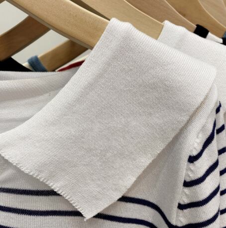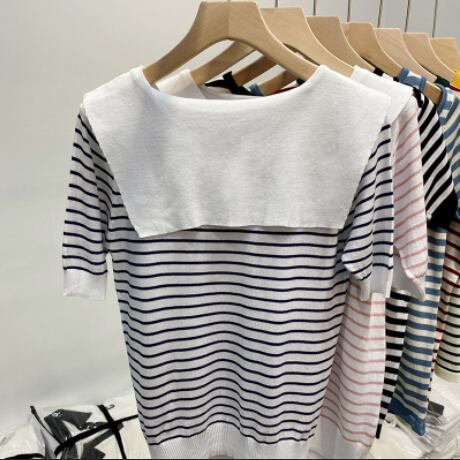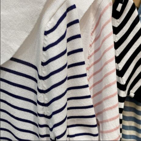 大きめのフラットカラーと細ボーダーが爽やかな印象のボーダーニットトップス。