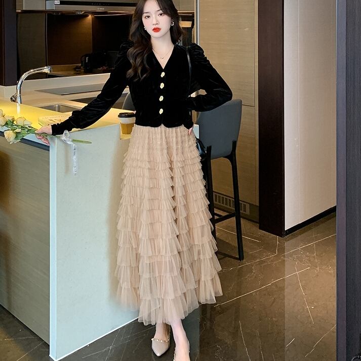 2点セット カーディガン 長袖 パフスリーブ Vネック 前開き デザインボタン ショート丈 ベルベット ロングスカート フレアスカート 段フリル シースルー かわいい 大人可愛い きれいめ シンプル 上品 おしゃれ レトロ かっこいい カジュアル こなれ感 個性的 主役級 存在感 抜け感 ベーシック ナチュラル エレガント フォーマル 女性用 レディース OL 通勤 デート お出かけ お泊まり 女子会 旅行 休日 カフェ ショッピング コンパ 普段使い デイリー イベント 着回し S M L XL