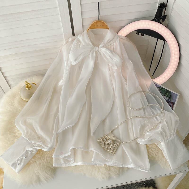 トップス ブラウス リボンタイ 長袖 ボリューム袖 プルオーバー ミディアム丈 シースルー 透け感 かわいい 可愛い 大人可愛い きれいめ シンプル 上品 レトロ おしゃれ かっこいい カジュアル こなれ感 個性的 主役級 存在感 抜け感 春 夏 ベーシック ナチュラル フェミニン ガーリー フォーマル 無地 女性用 レディース ママ OL 通勤 オフィス 学生 通学 デート お出かけ お泊まり 女子会 旅行 休日 カフェ ショッピング コンパ イベント 普段使い デイリー 着回し 重ね着 ワンサイズ
