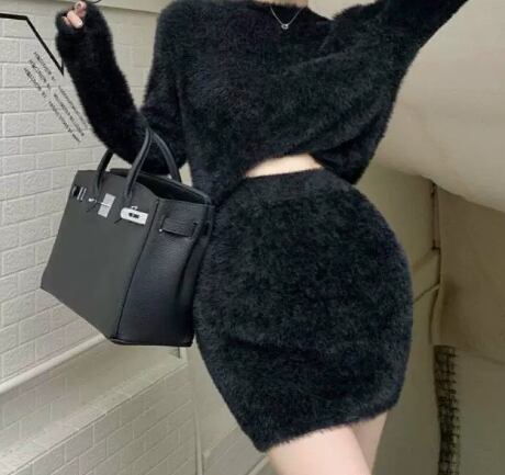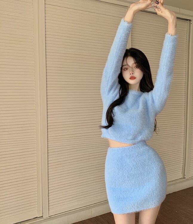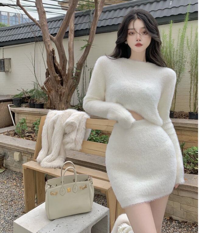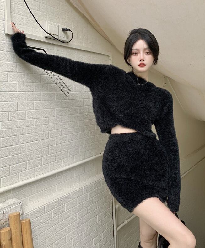 タイトなシルエットが美脚&脚長効果を引き立てるニットトップス×ミニスカートのセット。