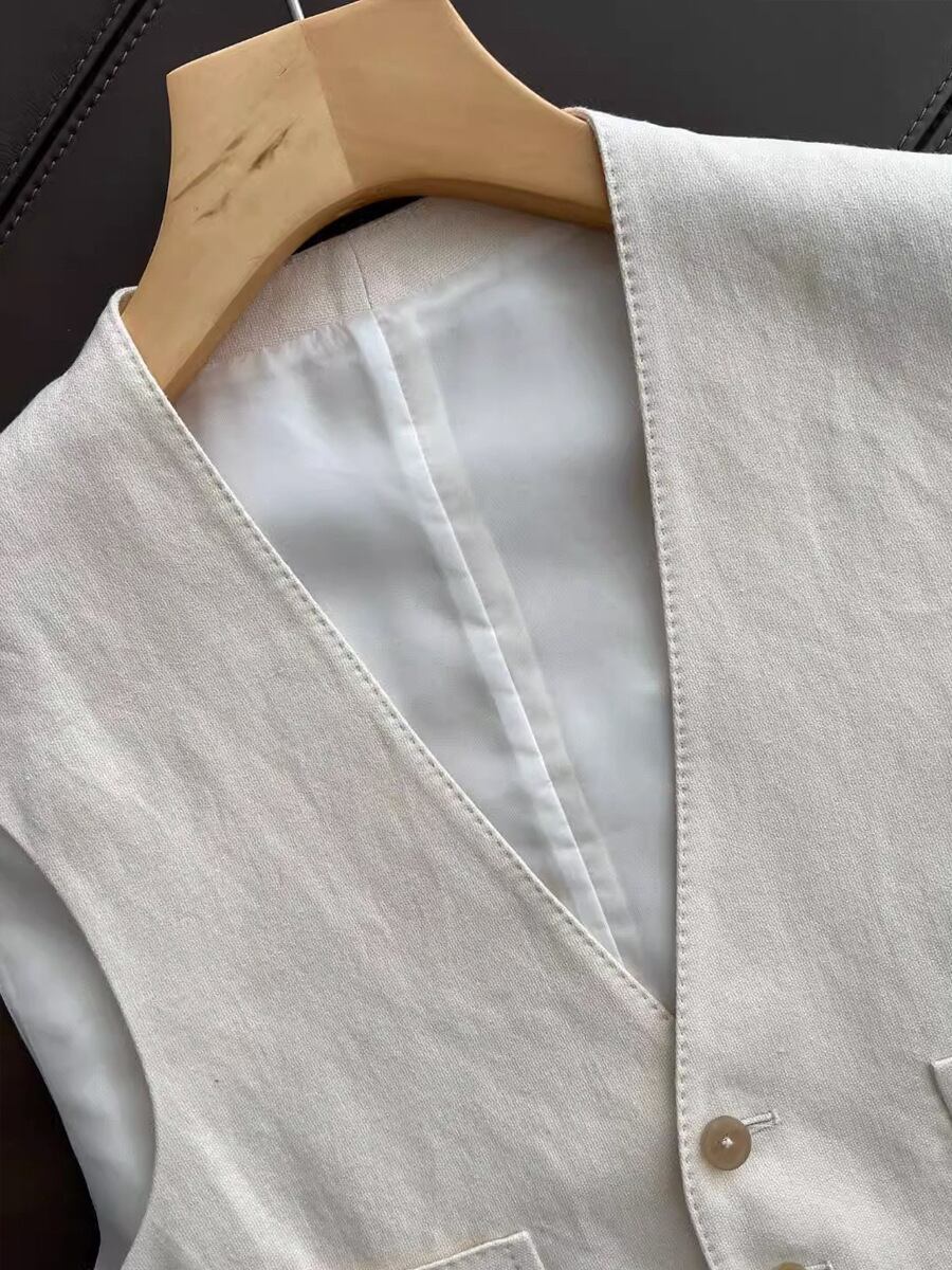 軽やかな着心地とスタイリッシュな印象を両立した、ノースリーブベストとワイドパンツのセットアップです。Vネックのすっきりとしたラインが顔まわりを美しく見せ、シンプルながらも大人の余裕を感じさせます。