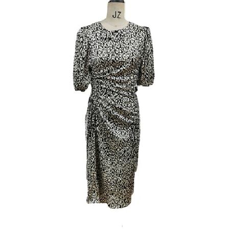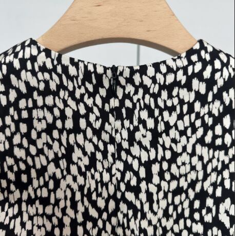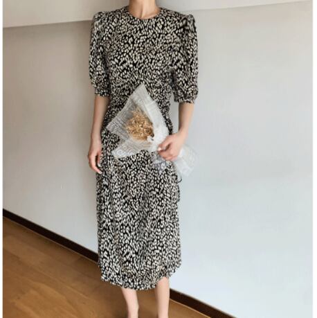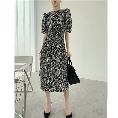 レディース ワンピース 膝下 ミモレ 5分袖 7分袖 パフスリーブ クルーネック Iライン サイドギャザー ポリエステル 大人可愛い きれいめ 上品 おしゃれ レトロ こなれ感 モード系 モダン 主役級 抜け感 都会的 クラシカル シック ドット柄 抽象柄 春 夏 秋 ロングシーズン ママ オフィス OL 通勤 デート お出かけ パーティー レストラン 休日 ショッピング カフェ 韓国 オルチャン コーデ 楽ちん 体型カバー レイヤード トレンド インスタ映え 高見え S M L ブラック オフホワイト