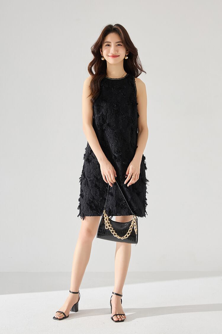 上品さと華やかさを兼ね備えたレディースドレス。膝上丈のタイトなシルエットにセミフレアを取り入れ、女性らしい美しいラインを引き立てます。ノースリーブのクルーネックデザインがデコルテをすっきりと見せ、清楚でありながら大人の魅力を演出します。