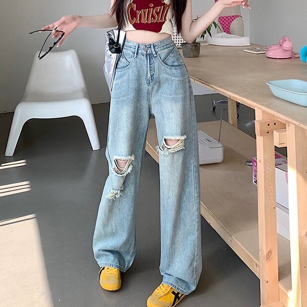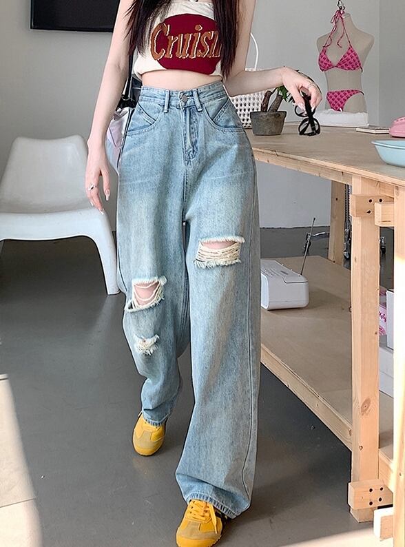 ハイウエストデザインで脚長効果抜群、ダメージ加工の個性的なスタイルはカジュアルからきれいめまで幅広く合わせられます。