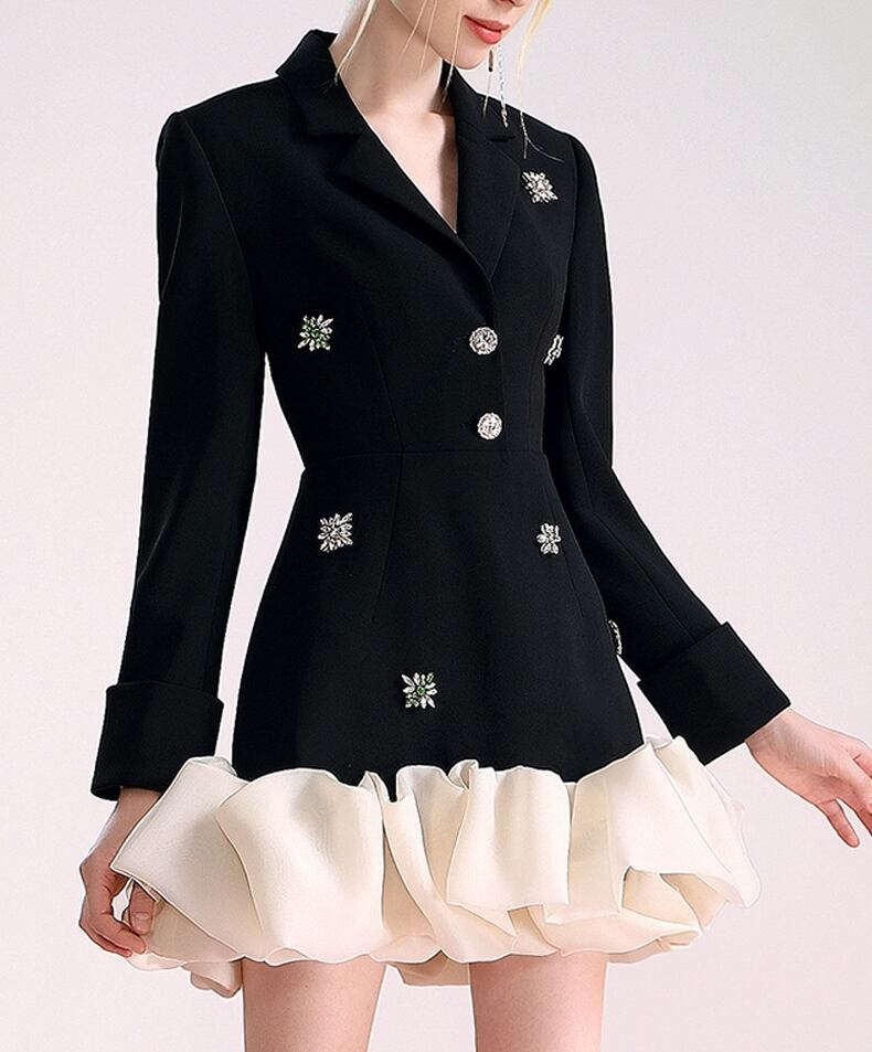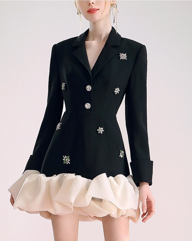 Vネックやフリル、ビジューが施されており、シンプルながらも存在感のある一着です。