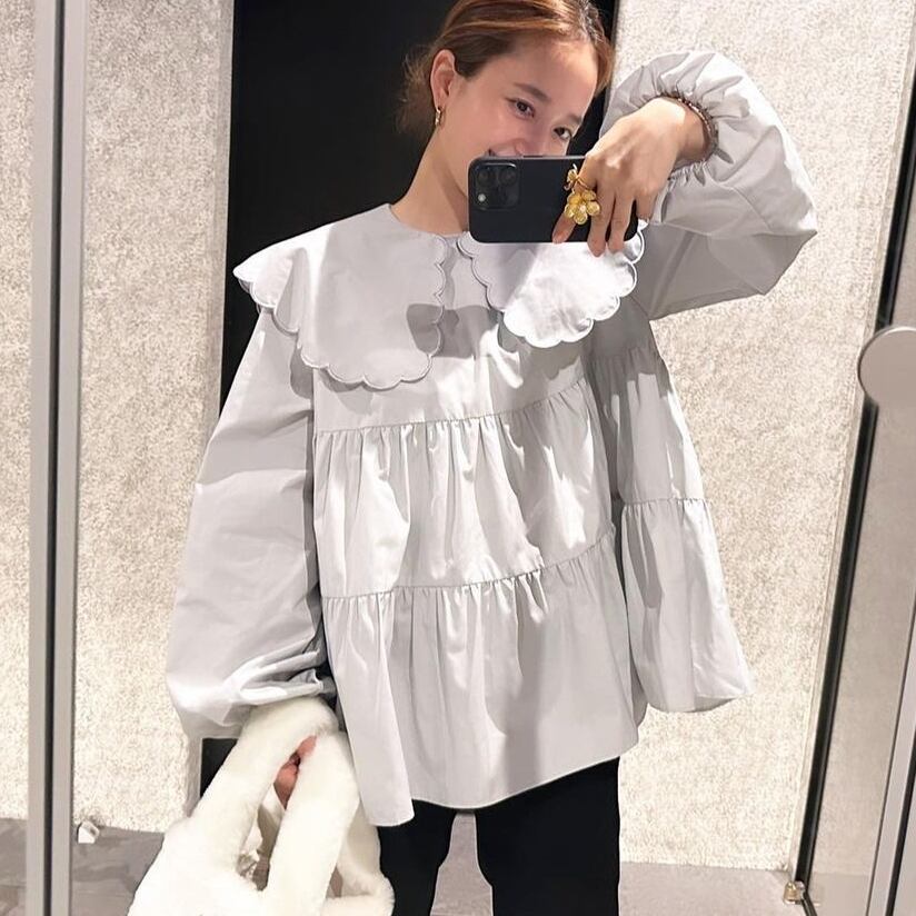 春夏のコーディネートにぴったりな長袖シャツは、ボリューム袖とビックカラーが魅力のプルオーバーです。