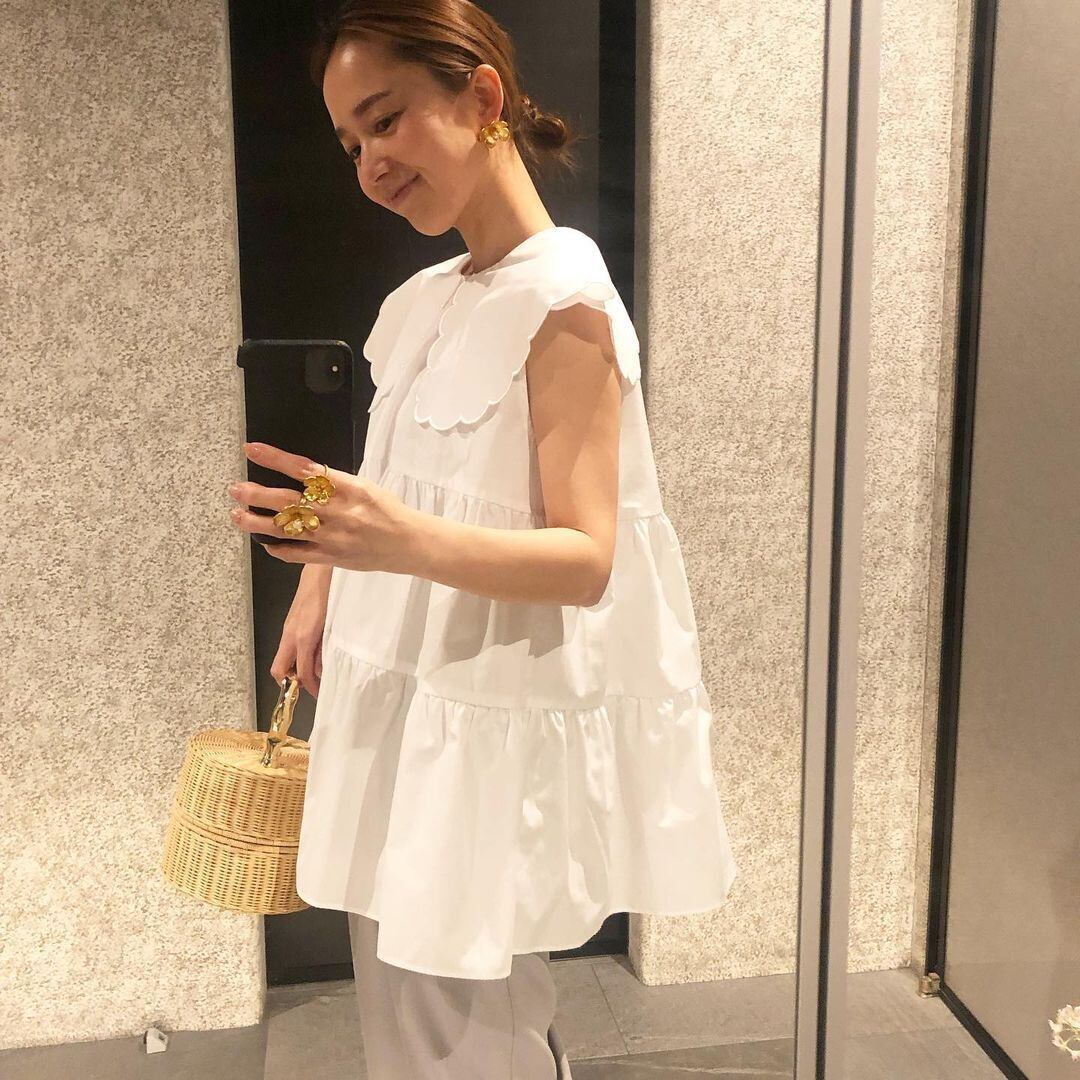 春夏のコーディネートにぴったりなノースリーブシャツは、襟付きのビックカラーがフェミニンさとレトロな魅力を引き立てる一枚。