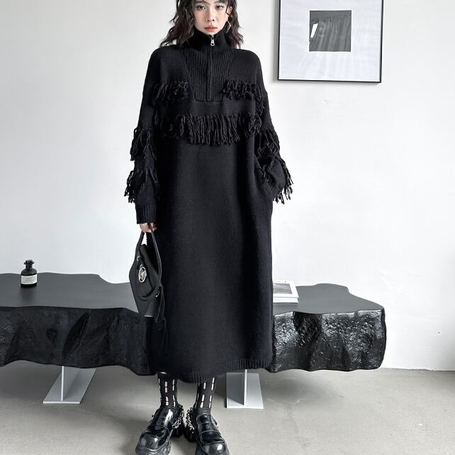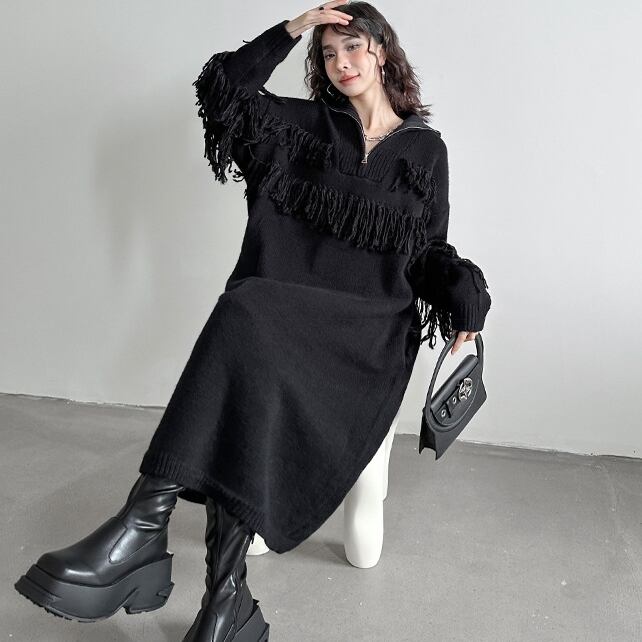 ワンピース ミモレ丈ワンピース 長袖 ハイネック ハーフジップ フリンジ ミモレ丈 可愛い かわいい 大人可愛い きれいめ シンプル 上品 おしゃれ レトロ かっこいい カジュアル こなれ感 個性的 主役級 存在感 抜け感 秋 冬 ベーシック ナチュラル エレガント 無地 女性用 レディース ママ マタニティ OL 通勤 オフィス 学生 通学 デート お出かけ お泊まり 女子会 旅行 休日 カフェ ショッピング コンパ 普段使い デイリー イベント 着回し 重ね着 脚長 ワンサイズ トレンド モテ