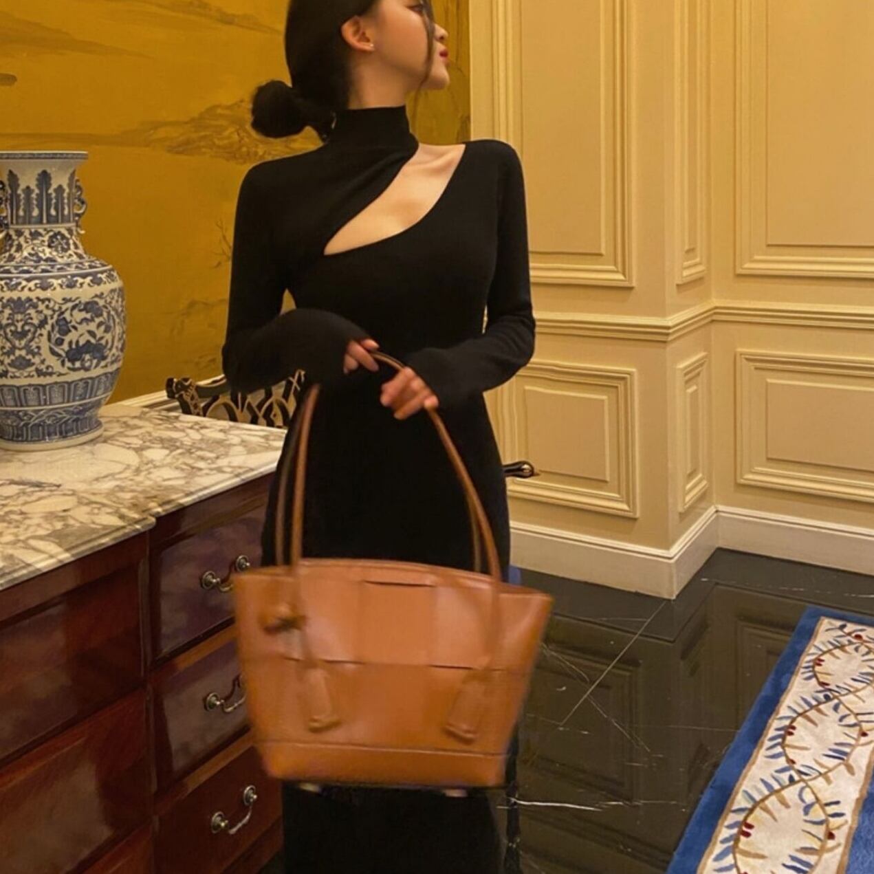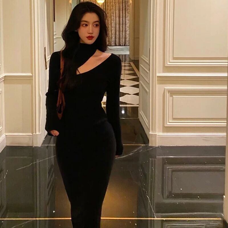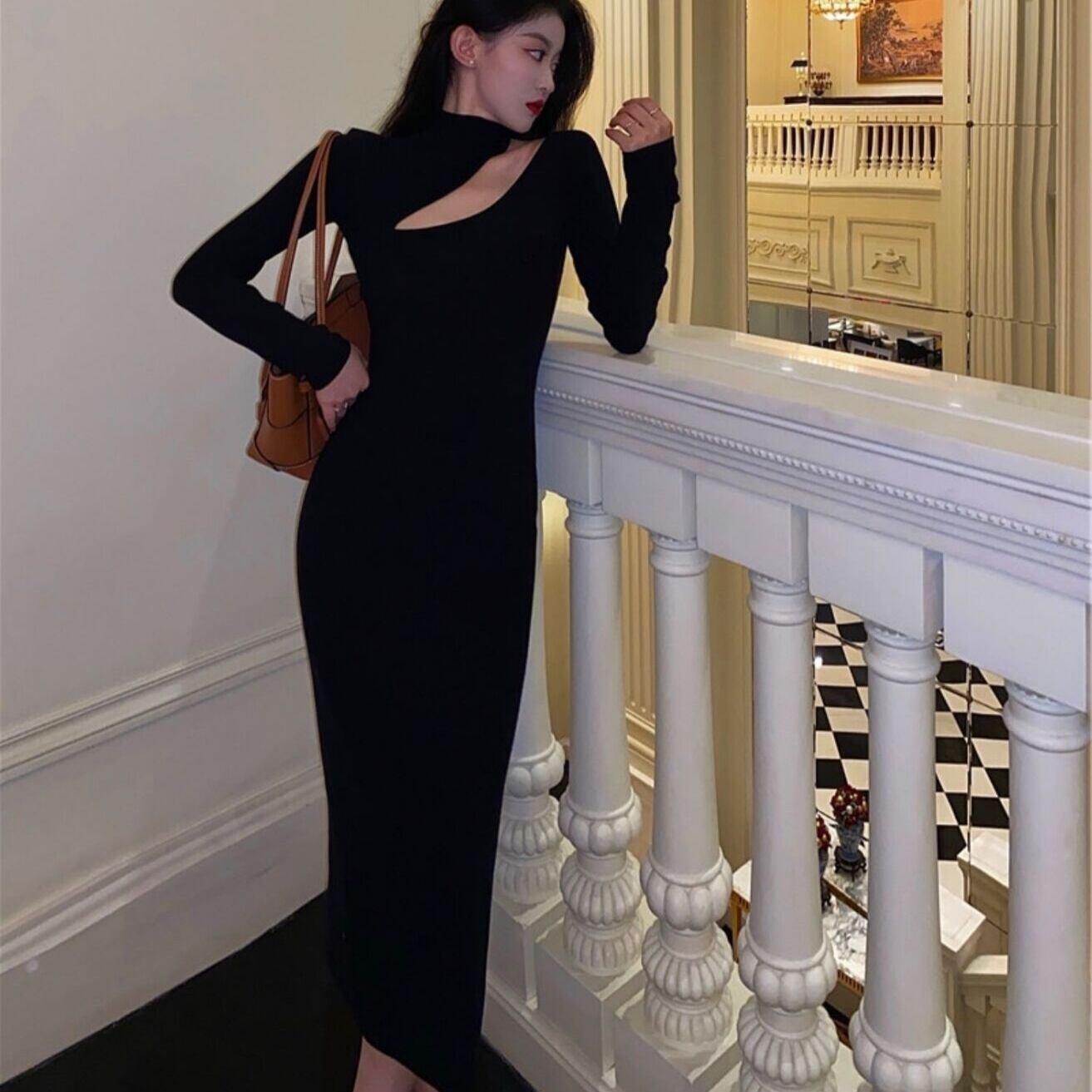 ワンピース ロングワンピース タイトワンピース 長袖 ハイネック カットアウトデザイン ロング丈 タイト 可愛い かわいい 大人可愛い きれいめ シンプル 上品 おしゃれ レトロ かっこいい カジュアル こなれ感 個性的 主役級 存在感 抜け感 秋 冬 ベーシック ナチュラル クール セクシー 無地 女性用 レディース ママ OL 通勤 学生 通学 デート お出かけ お泊まり 女子会 旅行 休日 カフェ ショッピング コンパ 普段使い デイリー イベント 着回し 重ね着 脚長 S M L XL モテ