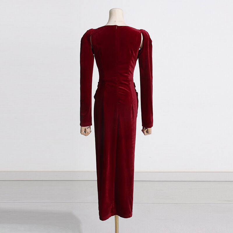 長袖、ハイウエスト、Iラインスカート、フロントスリットが魅力のこのワンピースは、重ね着風のデザインでシンプルながら上品な印象を与えます。