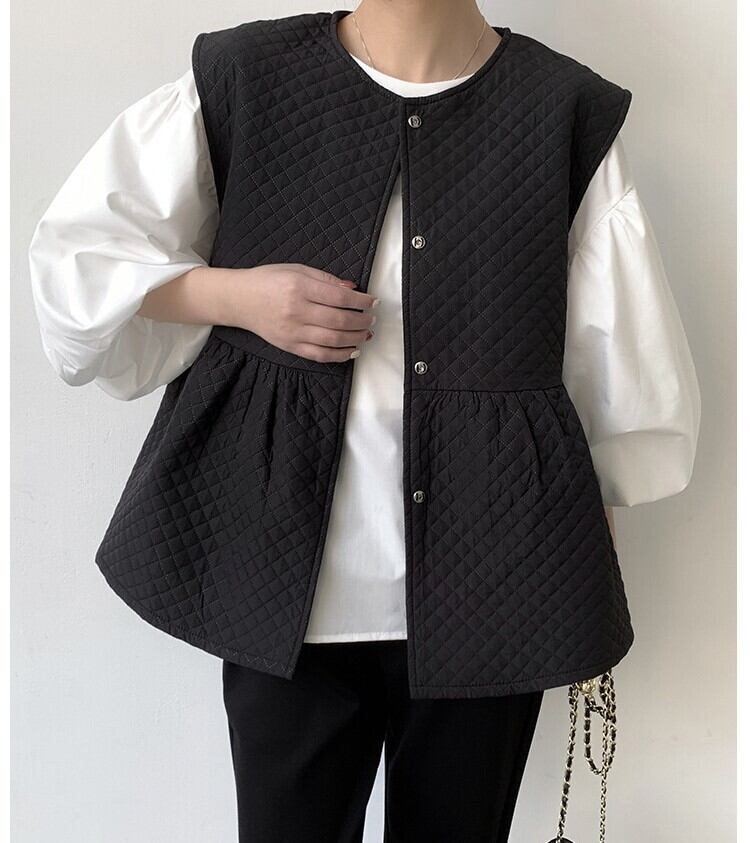 女性らしいシルエットを引き立てる、ペプラムデザインのレディースベストです。ラウンドネックとフロントボタンが上品で、シンプルながらも華やかさを感じさせる一枚。大人可愛い印象を演出し、春や秋のコーデにぴったりです。