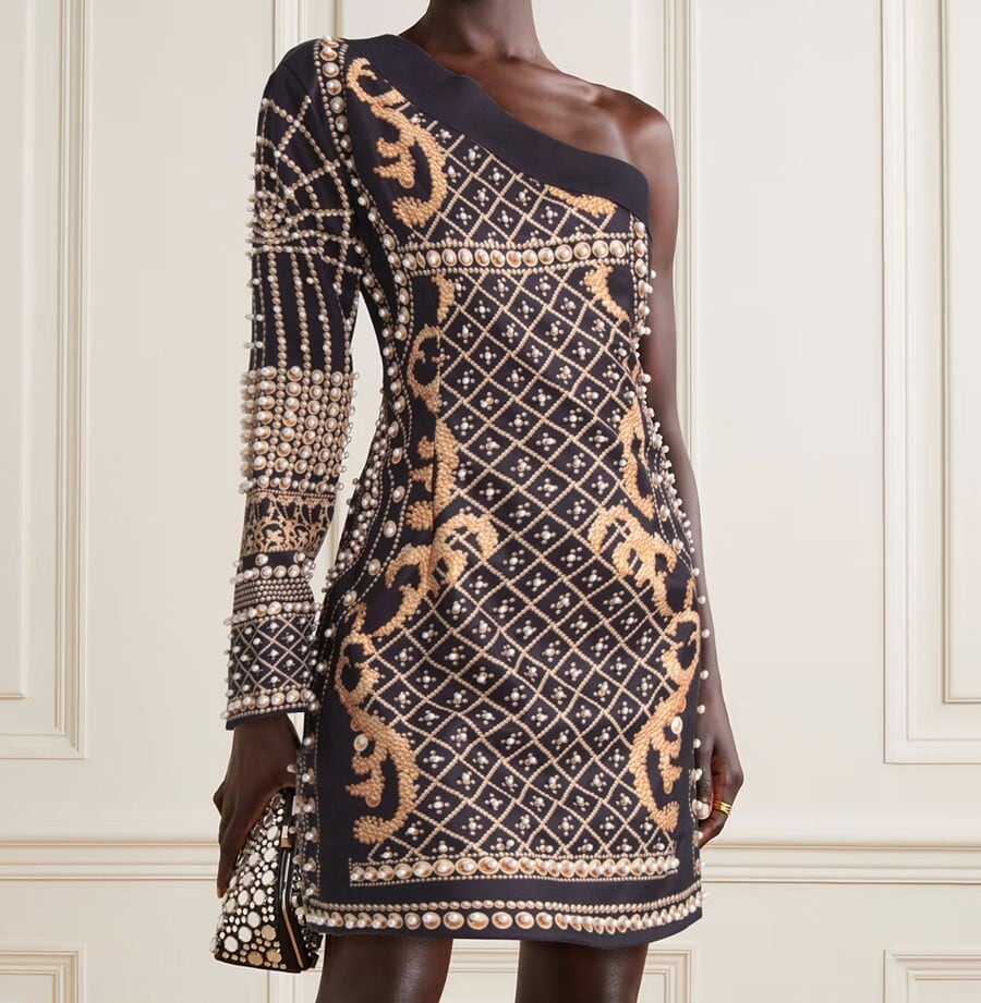 ワンショルダーのデザインが肩まわりをすっきりと見せ、エレガントさの中にさりげないセクシーさを添えます。膝上丈のショートスタイルは脚を長く見せ、スタイルアップ効果も抜群。