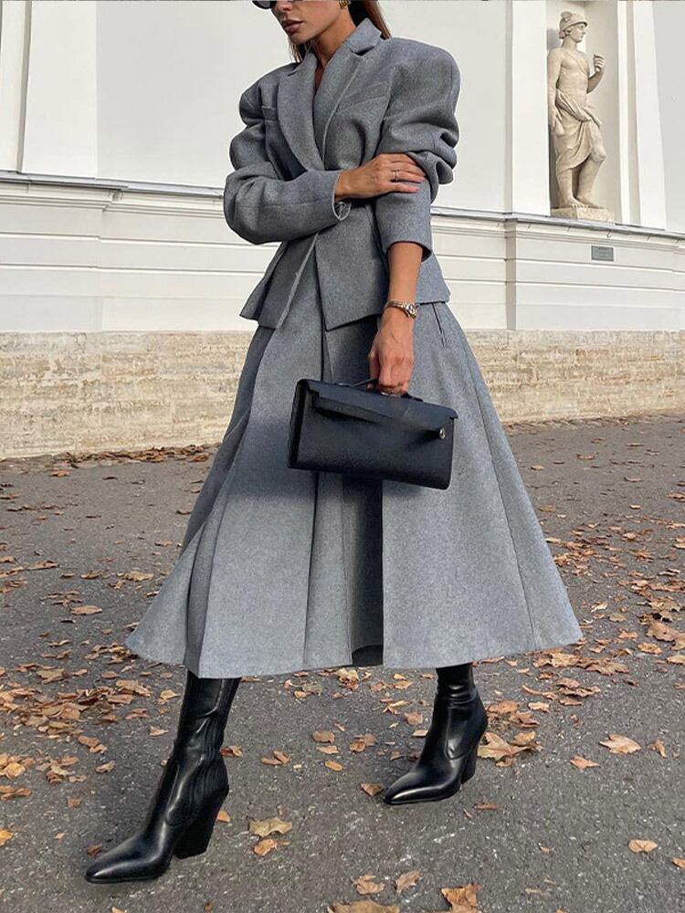 洗練されたデザインの2点セット、ジャケットとミモレ丈スカートのセットアップ