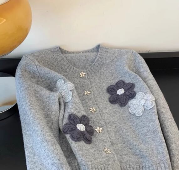 長袖のUネックデザインに、かわいいお花の刺繍のデザインと、お花のボタンが施されています。