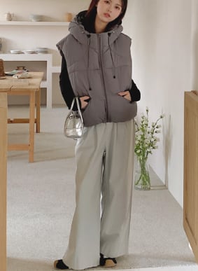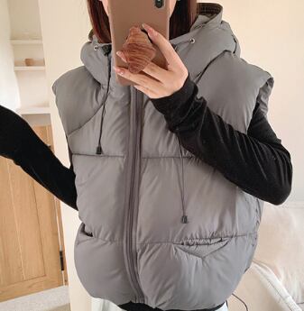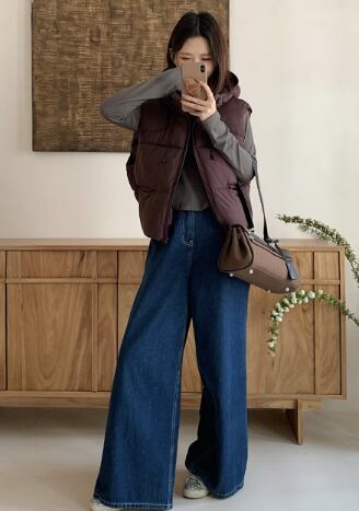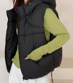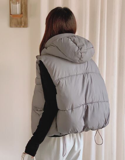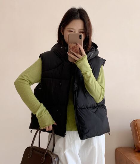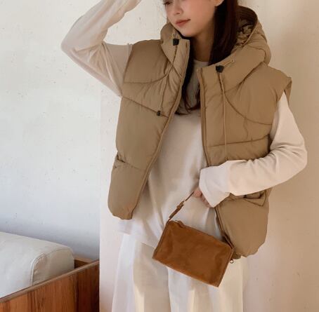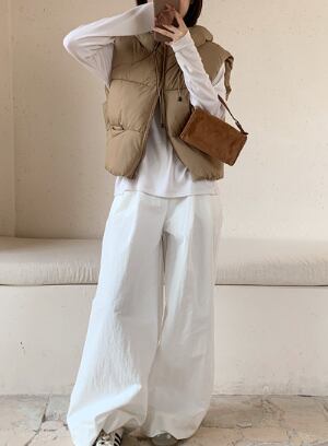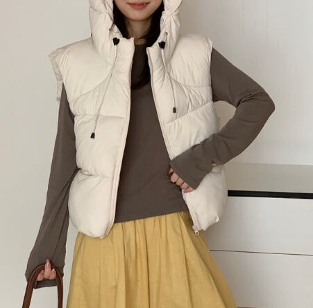 袖なしデザインで、ふっくらとしたダウンコットンを使用し、保温性がありながら軽やかさも兼ね備えています。