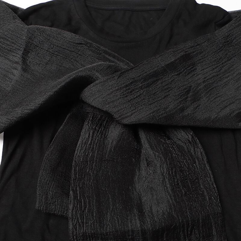身頃とは異なる生地を中央でクロスさせた重ね着風のデザインが、洗練された印象を与える長袖カットソー。クルーネックとタイトなシルエットが美しいラインを際立たせ、大人の女性らしい上品さを引き立てます。伸縮性があって着心地が良く、デイリー使いにもぴったりの一枚です。