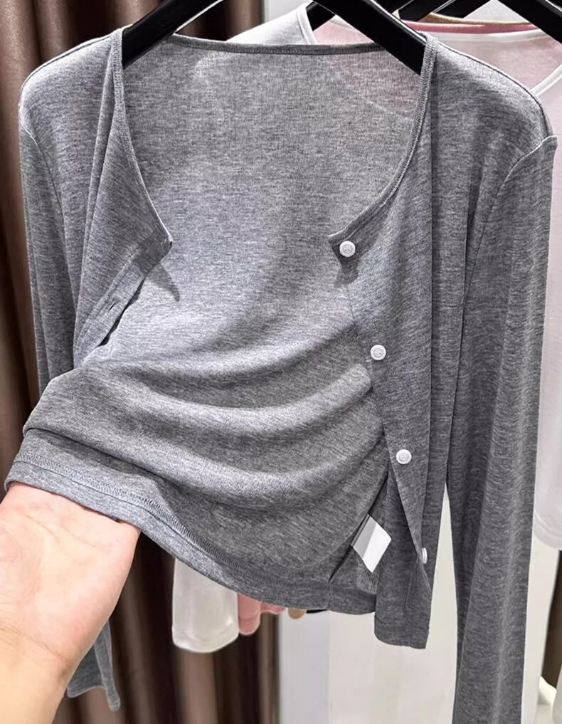前開きボタンデザインにラウンドネックが加わることで、シンプルでありながら上品な印象を与えます。