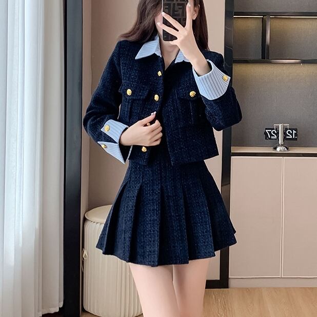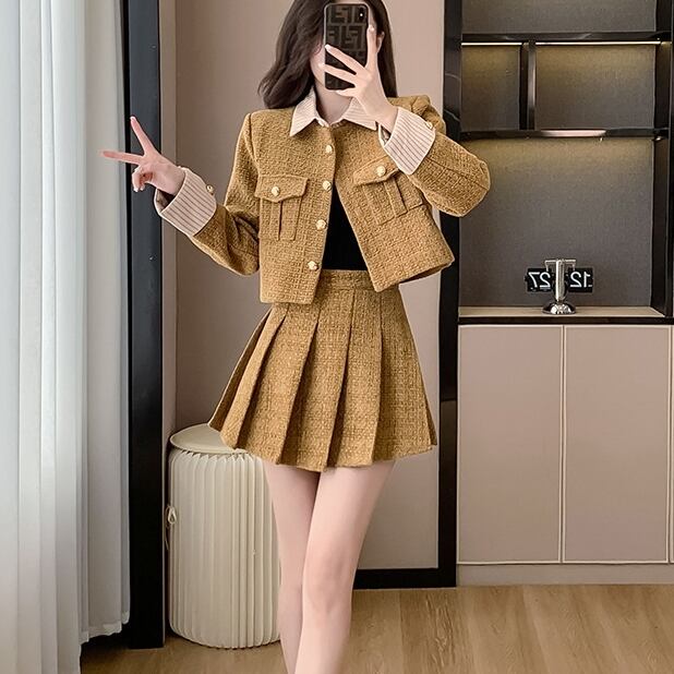 2点セット セットアップ ジャケット 長袖 襟付き 前開き ショート丈 ミニスカート ハイウエスト プリーツスカート 可愛い かわいい 大人可愛い きれいめ シンプル 上品 おしゃれ レトロ かっこいい カジュアル こなれ感 個性的 主役級 存在感 抜け感 ベーシック ナチュラル エレガント キュート 無地 女性用 レディース OL 通勤 オフィス 学生 通学 デート お出かけ お泊まり 女子会 旅行 休日 カフェ ショッピング コンパ 普段使い デイリー イベント 着回し 重ね着 脚長 S M L XL