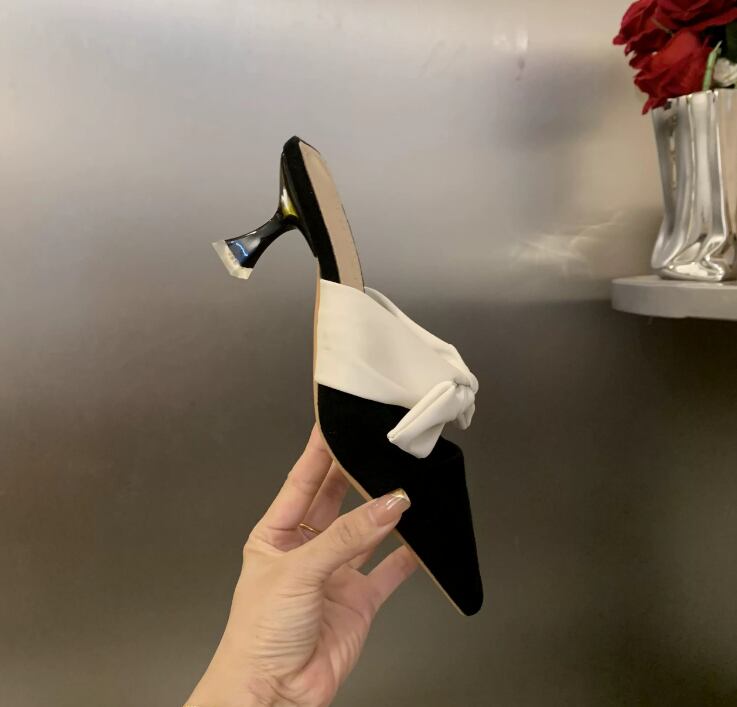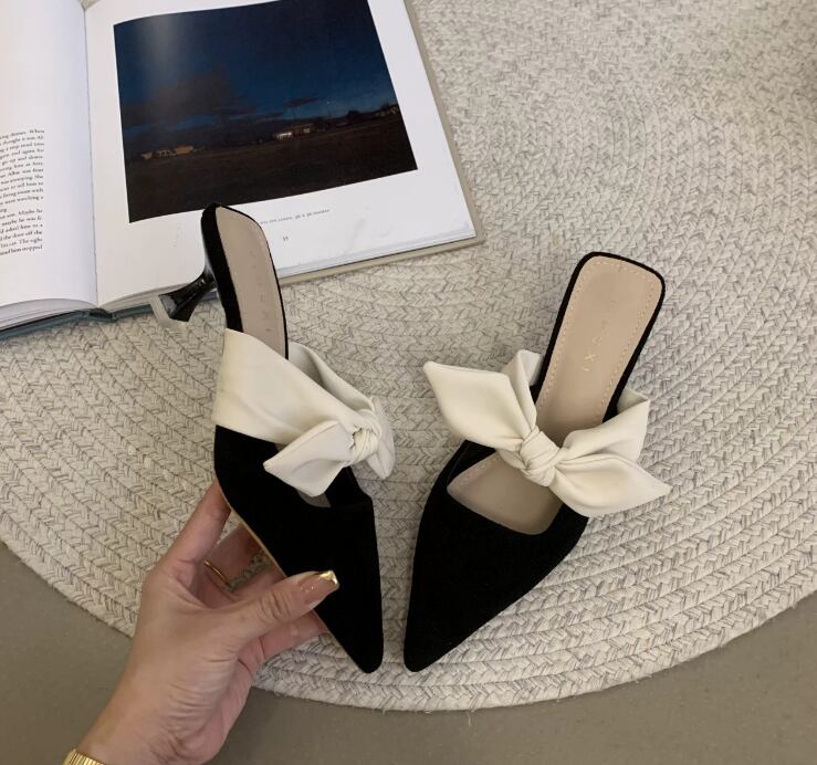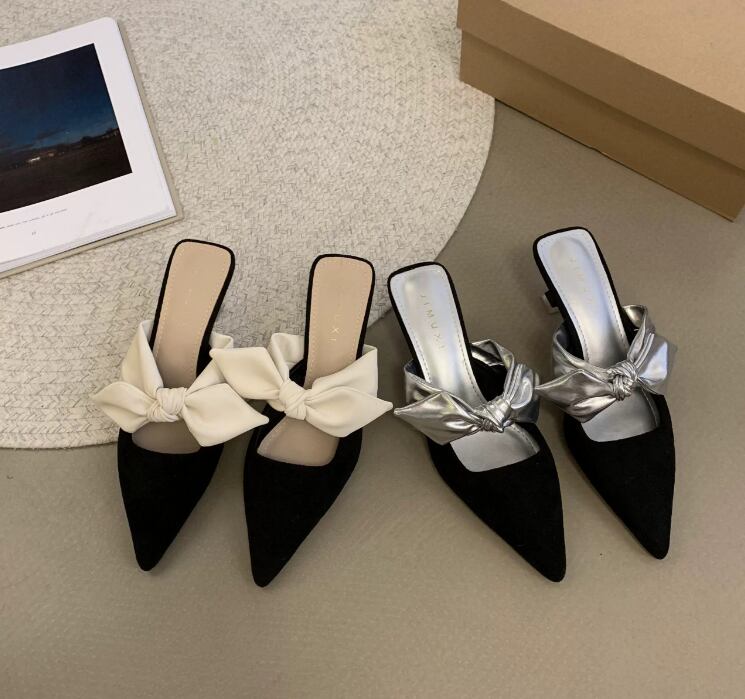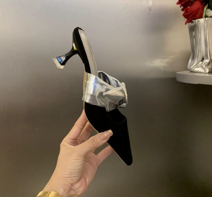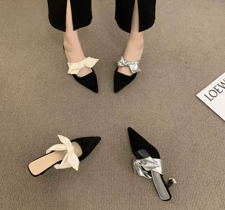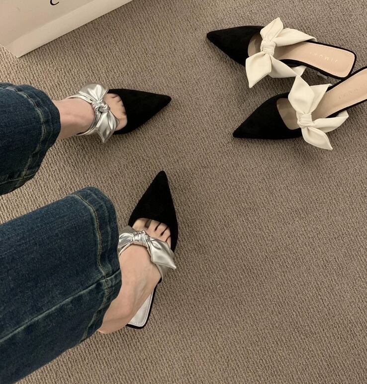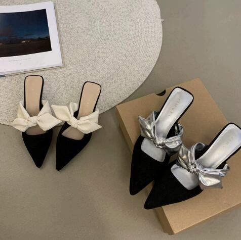 リボンデザインが華やかさを添える、ポインテッドトゥのミュール。