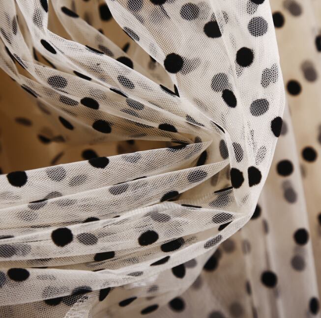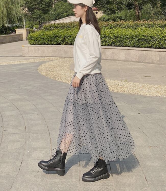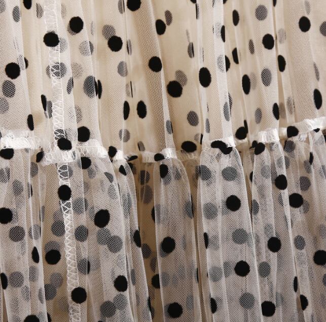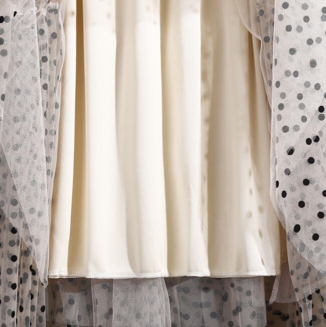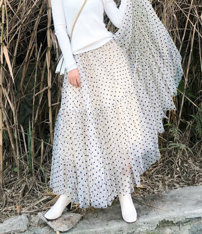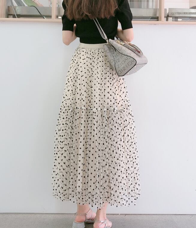 ふんわりチュールが揺れる、ドット柄のAラインロングスカート。