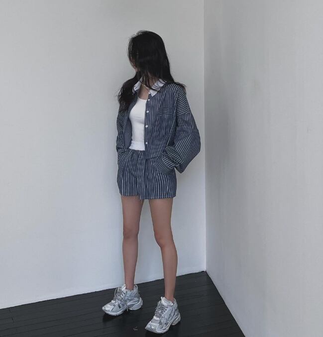 ストライプデザインが縦のラインを強調し、美脚・脚長効果を演出。