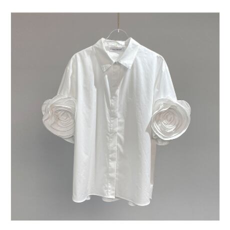 立体フラワースリーブが印象的な、上品で華やかなコットンシャツ。