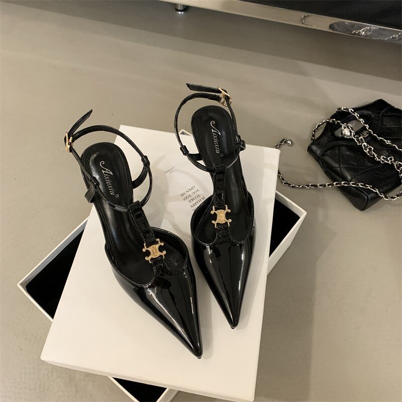 上品な輝きを放ピンヒールパンプス。ポインテッドトゥのすっきりとしたラインが脚をより長く見せ、T地ストラップと金色の金具アクセントが大人の女性らしさを引き立てます。シンプルながらも高級感があり、デートやイベント、パーティーまで幅広く活躍。
