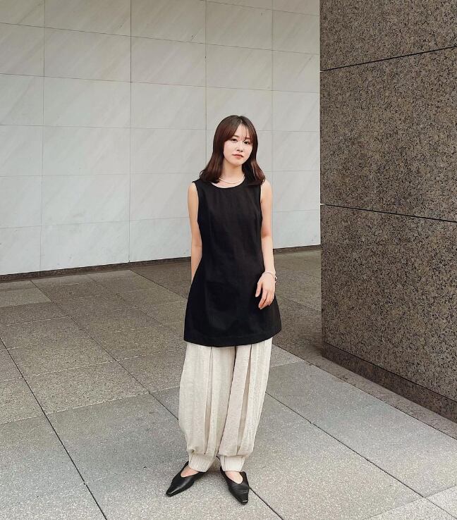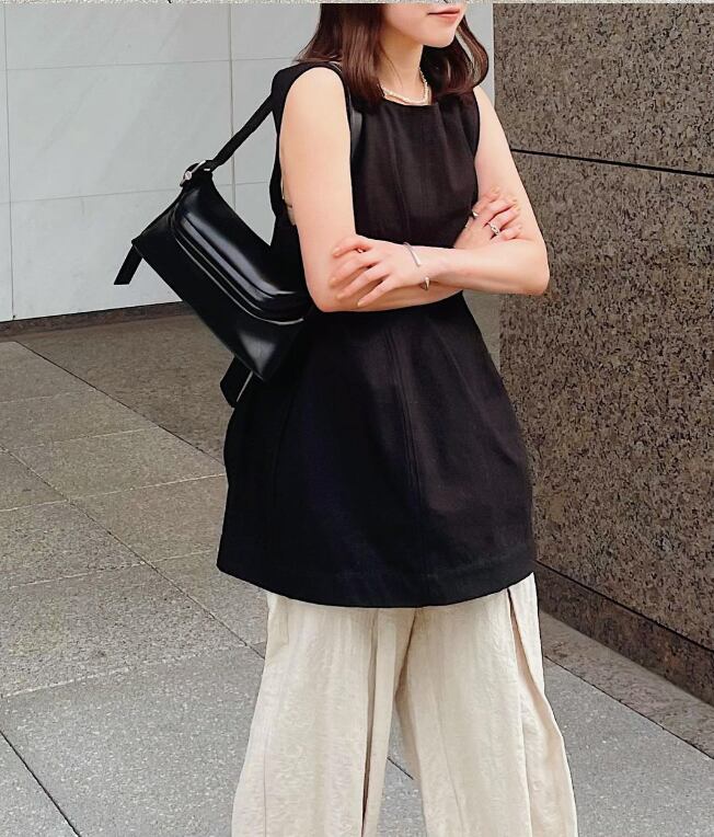 ラウンドネック×ノースリーブで、抜け感のある洗練された印象に。