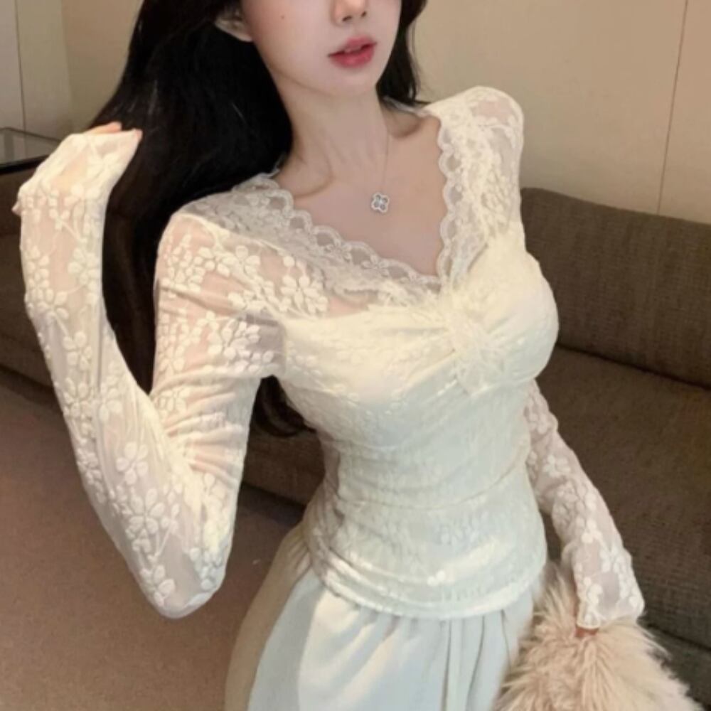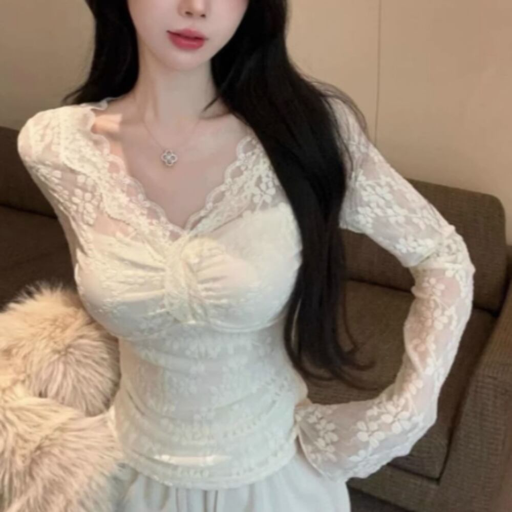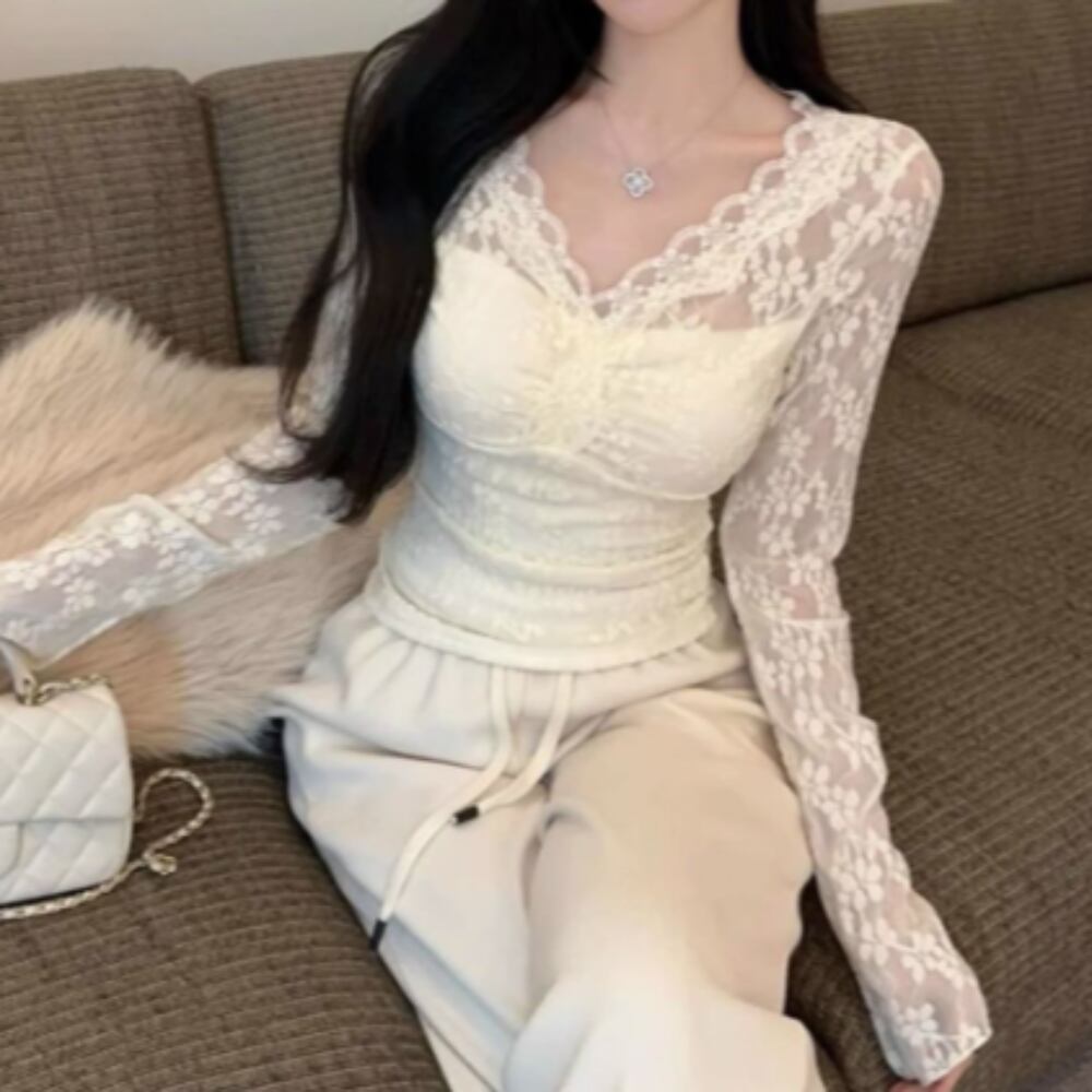 シースルーのレース部分が、少し肌を覗かせて大人の女性らしさをさりげなく演出。普段使いはもちろん、デートや女子会、旅行といった特別なシーンでも主役級の存在感を発揮します。春、秋、冬とシーズンを問わず重ね着や着回しにも最適なベーシックアイテムです。