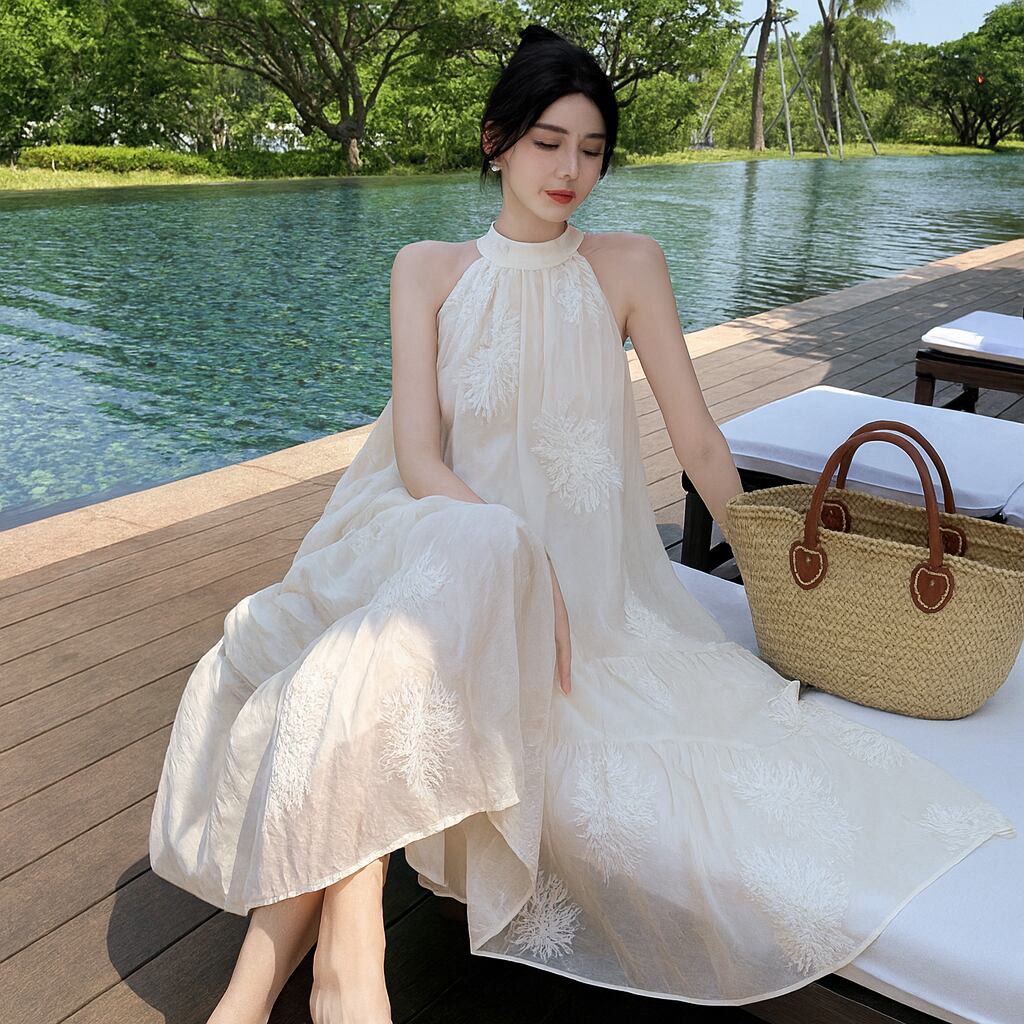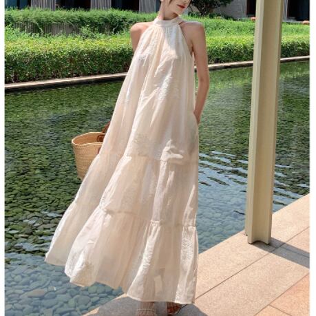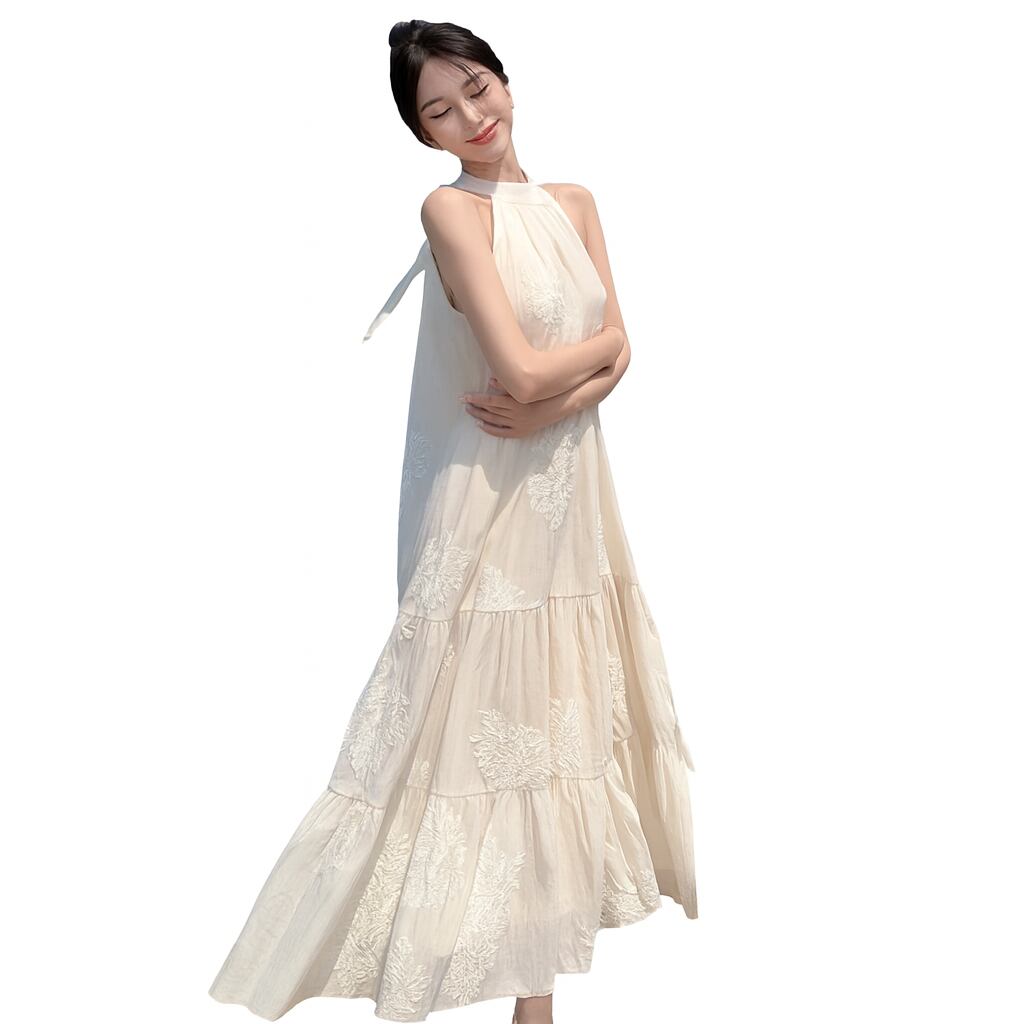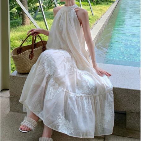 レディース ワンピース ロング ノースリーブ ハイネック ホルターネック フレア Aライン ティアード フェミニン 刺繍 バックリボン 透け感 切り替えデザイン 薄手 ポリエステル 大人可愛い きれいめ シンプル 上品 おしゃれ こなれ感 エレガント モダン 主役級 存在感 抜け感 クラシカル ロマンティック ナチュラル フラワー 春 夏 ママ マタニティ デート お出かけ リゾート 旅行 ビーチ 休日 カフェ 韓国 コーデ 楽ちん 体型カバー 清楚 トレンド インスタ映え S M L オフホワイト