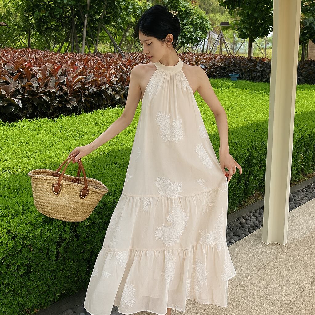 ふんわり広がるティアードデザインと刺繍が魅力のホルターワンピース。