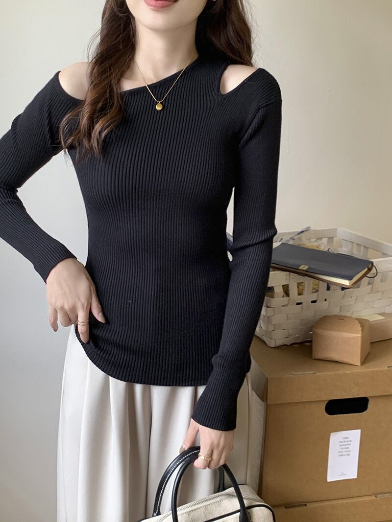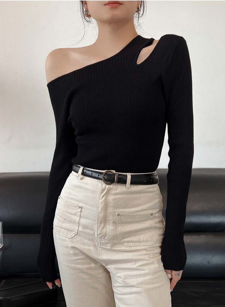 トップス ニットソー 長袖 ワンショルダー カットアウトデザイン プルオーバー ミディアム丈 タイト 可愛い かわいい 大人可愛い きれいめ シンプル 上品 おしゃれ レトロ かっこいい カジュアル こなれ感 個性的 主役級 存在感 抜け感 春 秋 冬 ベーシック ナチュラル エレガント キュート 無地 女性用 レディース ママ OL 通勤 オフィス 学生 通学 デート お出かけ お泊まり 女子会 旅行 休日 カフェ ショッピング コンパ 普段使い デイリー イベント 着回し 重ね着 ワンサイズ