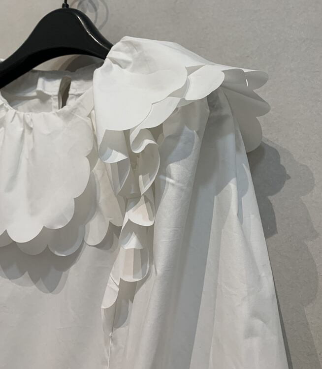 柔らかな素材が動くたびに軽やかに揺れ、女性らしさを引き立てる。