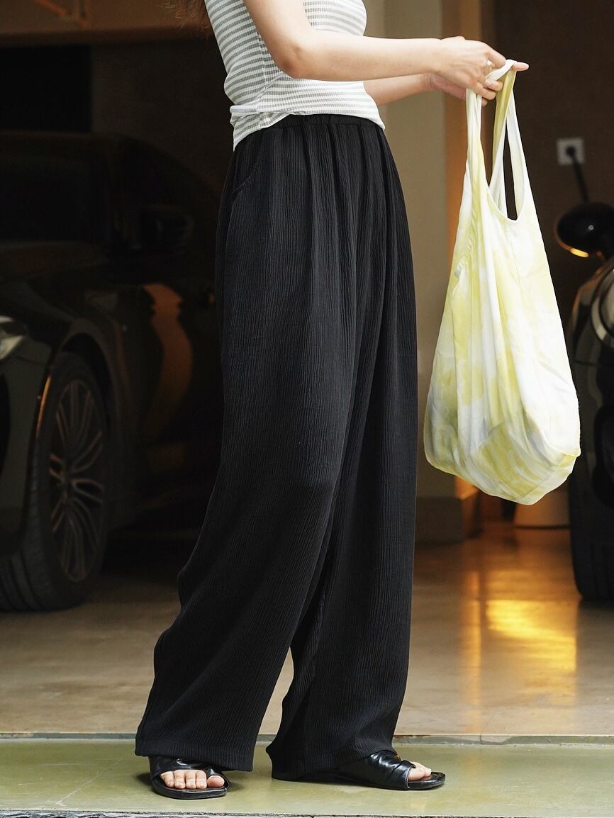 リラックス感溢れるハイウエストのワイドパンツ。