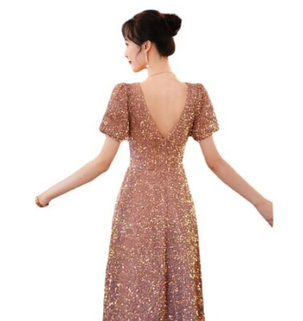 エレガントなVネックとタイトなIラインが美しいシルエットを生み出し、脚長効果を引き立てます。袖なしのデザインは、ラウンジやクラブ、さらには特別なパーティーや演奏会でも大人可愛い印象を与えます。